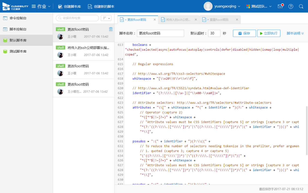 通过脚本控制台可以将预定义的脚本导入到行云管家中的主机上执行,实现同时对多台主机批量执行指定脚本的功能,并支持脚本的自定义。