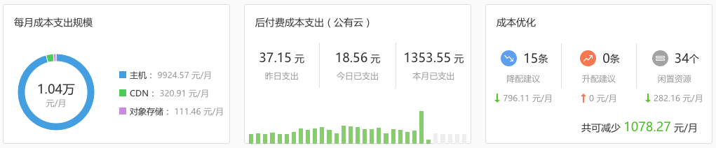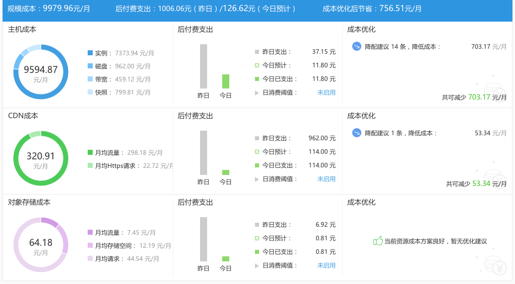 根据云账户下的云资源(包含云主机、CDN、对象存储)规模,按照云厂商的收费标准,统计每个月的云资源总成本支出。