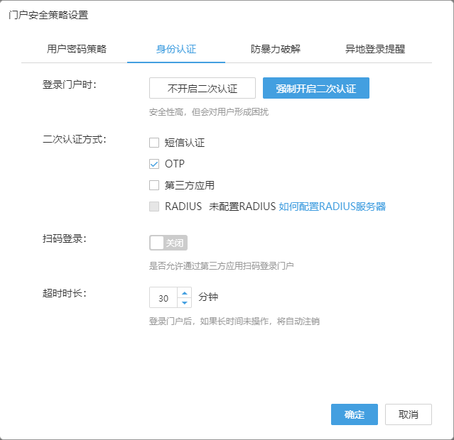 为了确保用户账号安全,除高强度的密码约束外,还提供以下方式的双因子二次身份认证:USB Key、手机短信验证码、微信/企业微信/钉钉验证码等第三方应用、手机动态令牌、Radius验证。