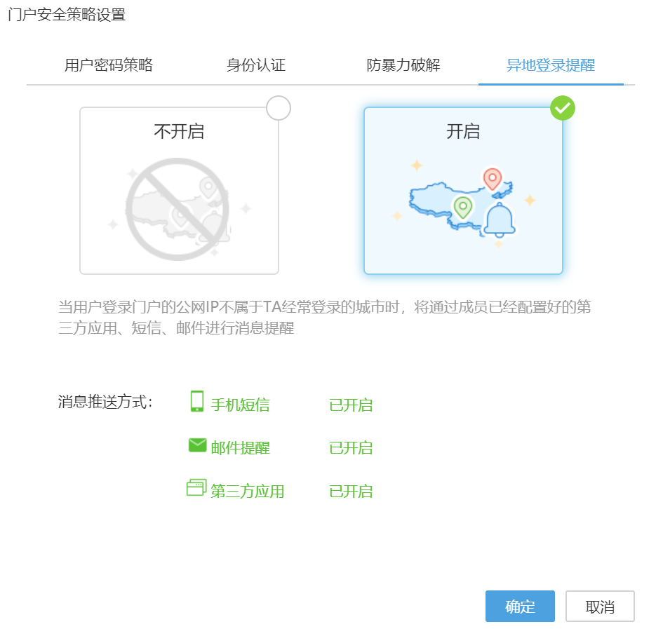 在互联网部署模型下,通过开启用户异地登录提醒,当发现用户登录地址和日常行为不一致时,会及时通知用户,降低账号被盗风险。