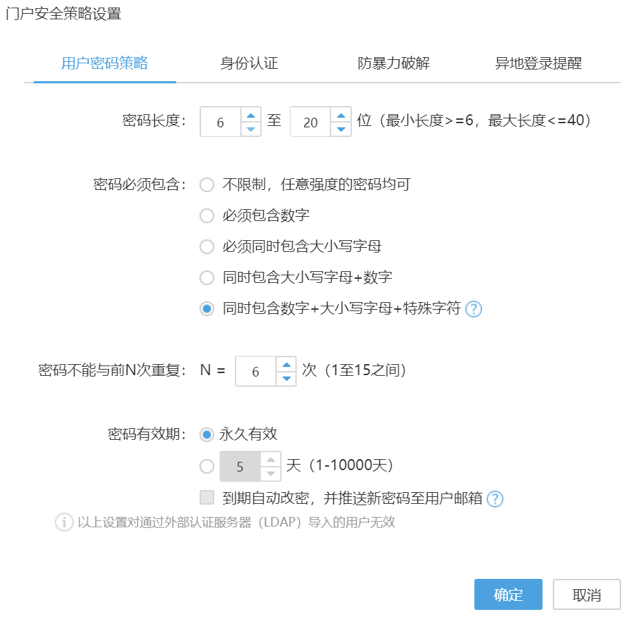 管理员可灵活定义用户密码强度、历史密码重复次数、有效期,防止出现弱密码、历史密码等安全风险。