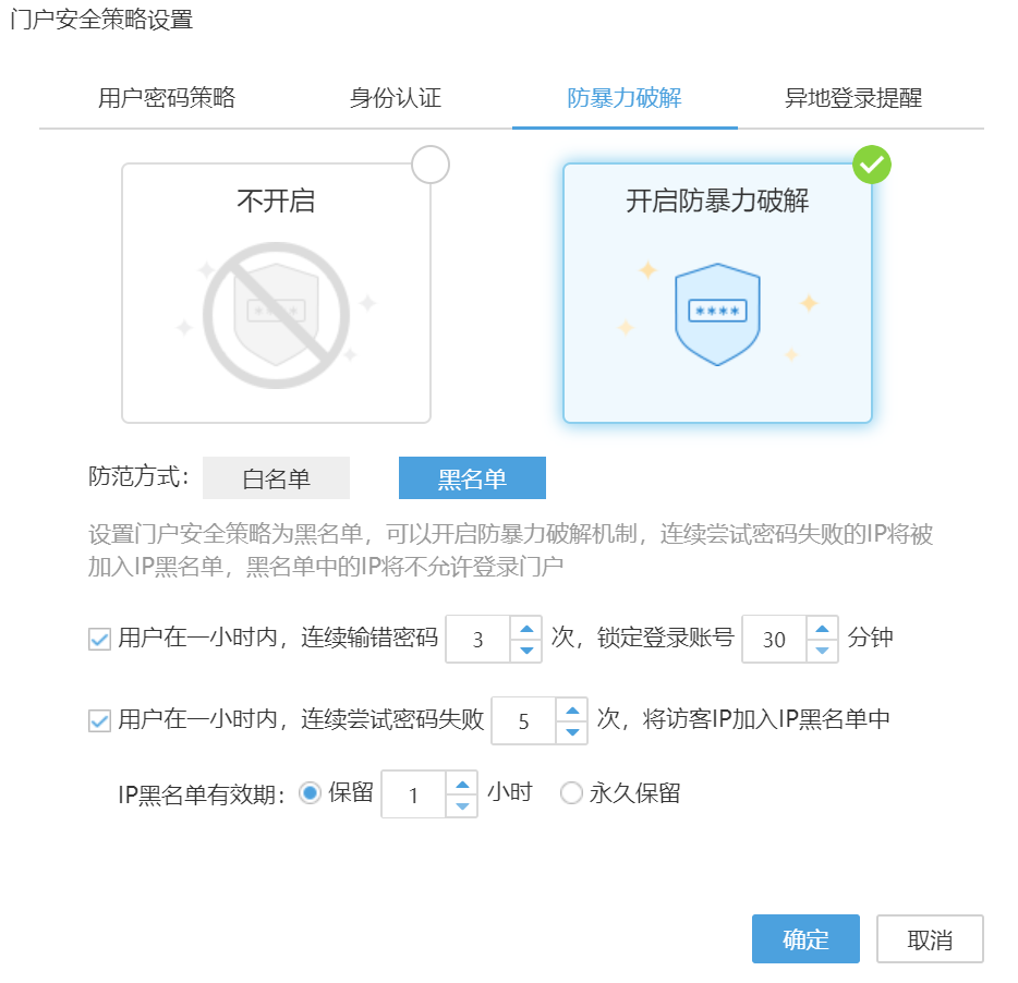 通过开启用户登录防暴力破解机制,可避免用户登录信息被撞库的风险。防范方式包括白名单和黑名单两种机制,在黑名单机制下,可灵活定义用户密码连续错误次数阈值、锁定账号时长、加入黑名单时长等配置参数。