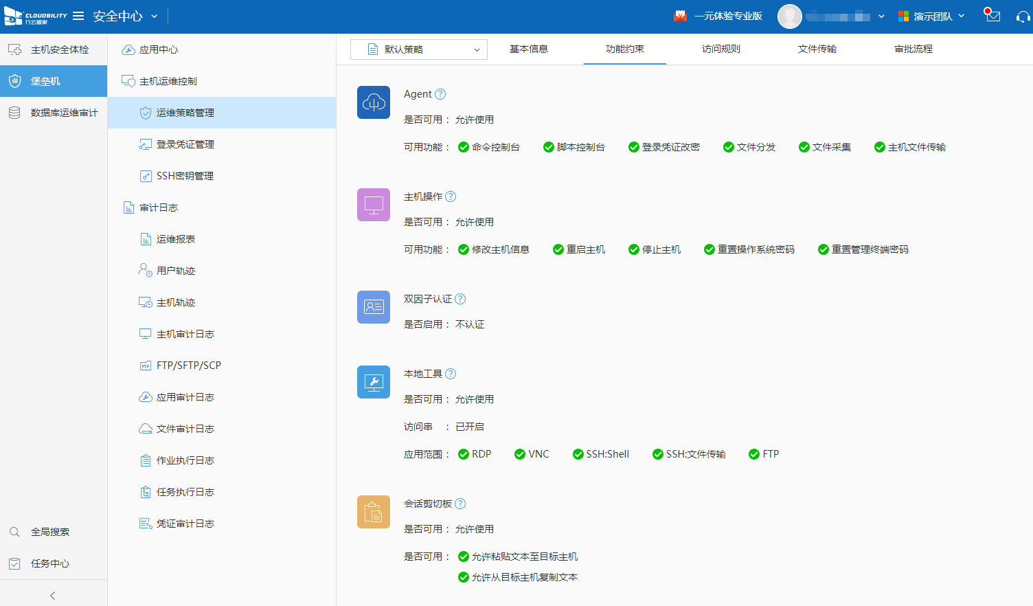 3、主机运维策略,进入 行云管家 安全中心,可看到有安全体检、 堡垒机、数据库运维审计3大核心功能,其中堡垒机提供了运维策略管理。在行云管家中,我们把这些安全性更高的主机叫做关联设备,我们通过创建主机运维策略组与关联设备进行关联,而将在这些主机上所执行的高危指令的定义以及相应的处理方式叫做主机运维策略。主机运维策略分为以下几种功能:创建运维策略、功能约束策略、访问规则策略、文件传输策略、审批流程策略,对于一些安全要求更高的主机来讲,即使登录了主机,成员在其中执行操作,通过主机运维策略依然可以让云主机处于安全监管之下,对其所执行的高危指令进行拦截,提前防范运维风险。