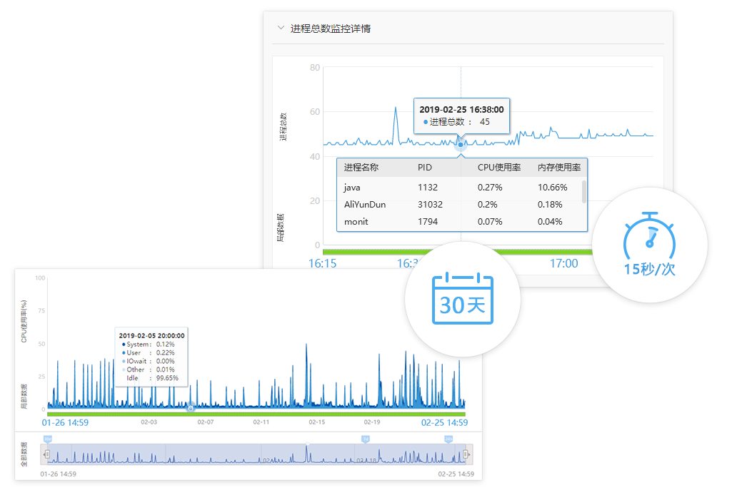 行云管家以高达15次/秒的数据采样频率进行监控数据采集,并且支持长达30天的监控数据存储。