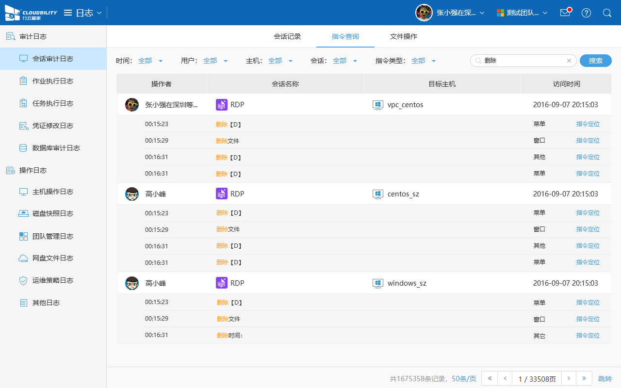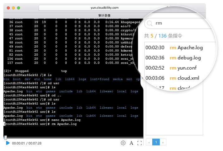 在对某些关键操作进行检索时,单纯的通过审计录像去逐帧播放是效率极低的方法, 行云管家 能够支持Windows全系列操作系统、Linux/Unix操作系统、数据库SQL执行语句的操作指令进行分析并记录,在查找关键操作时,只需进行指令的全文检索即可准确定位。