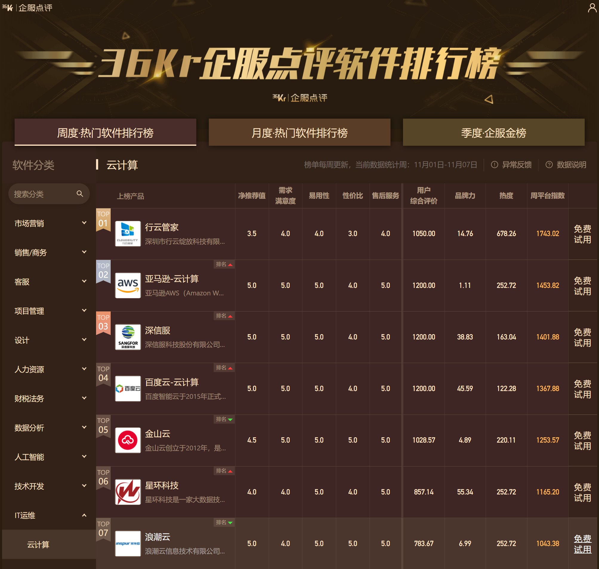 为中国新经济参与者的卓越品牌和开创性平台——36kr,其旗下中国最专业的企业级软件和服务选型平台“企服点评”公布了最新一期的“36kr企服点评软件排行榜”, 行云管家 荣登IT运维板块云计算、网络安全、运维管理平台、IT资产管理等领域的热门软件排行榜NO.1,从数百家软件厂商中脱颖而出。