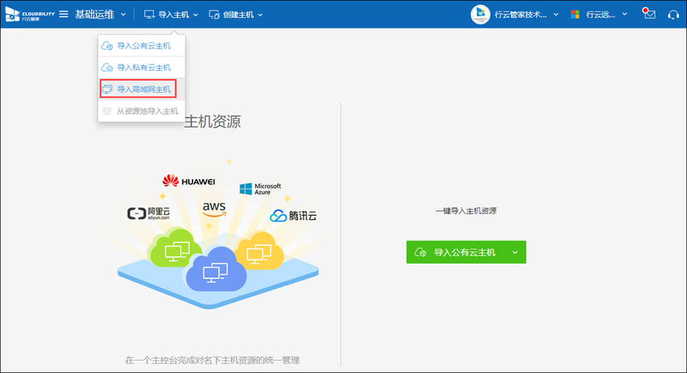 (1)在“基础运维”-“主机管理”栏目中,点击“导入主机”-“导入局域网主机”菜单。