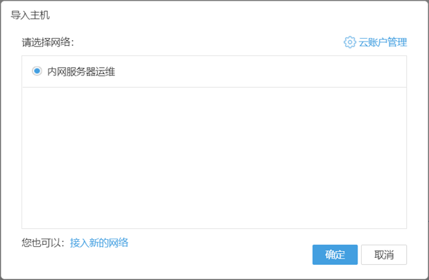 (5)此时可以看到该局域网已接入完成,点击“导入主机”-“导入局域网主机”菜单,选择已有的网络,如图刚创建的“内网服务器运维”,点击确定。