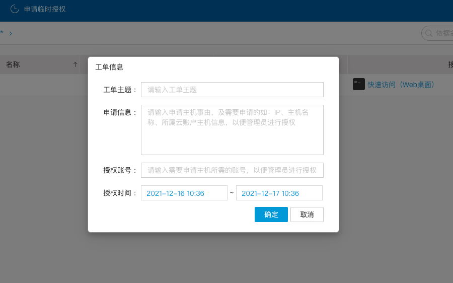 (1)团队成员可在主机管理中发起临时授权申请,此时申请会以工单的方式通知管理员。管理员可以为团队成员授权主机、操作主机的时间和策略。