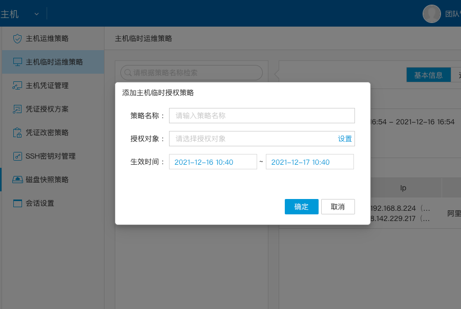 (2)在运维控制中,管理员可以在主机临时运维策略创建临时授权方案,并授权给团队成员,以此达到临时主机授权的目的。