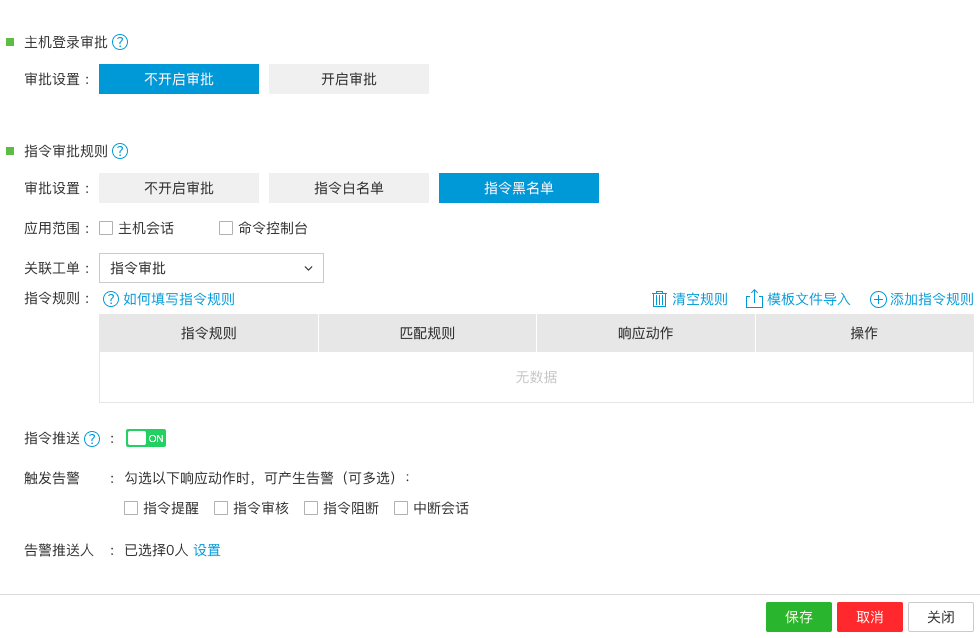 为了满足等保需求,在新版本中,运维策略支持敏感指令告警推送,可以让用户第一时间定位到输入敏感指令的会话中。