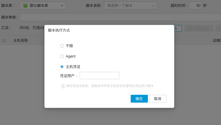 在新版本中,脚本控制台选择主机后,可以批量选择所选主机下相同名称的主机凭证来执行脚本。