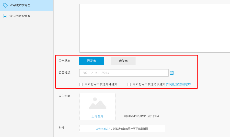 在过去的版本中,公告栏文章首先是会出现在门户的首页中,无法第一时间提醒用户有新的公告通知,新版本中,公告支持邮件和短信通知,能够第一时间提醒用户。