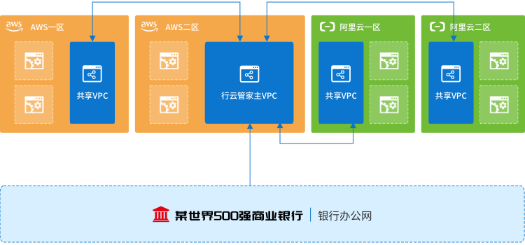 在使用云服务时,基于安全因素考量,该银行客户选择了VPC网络部署模式,由位于VPC内的云主机对外提供相应的Web服务。一方面是严格受限的办公内网,一方面是100多个项目组的云资源广泛分布在AWS、阿里云之上,复杂网络环境下的网络互通不仅是个难题,如何保证各小组之间的数据隔离,也十分棘手。