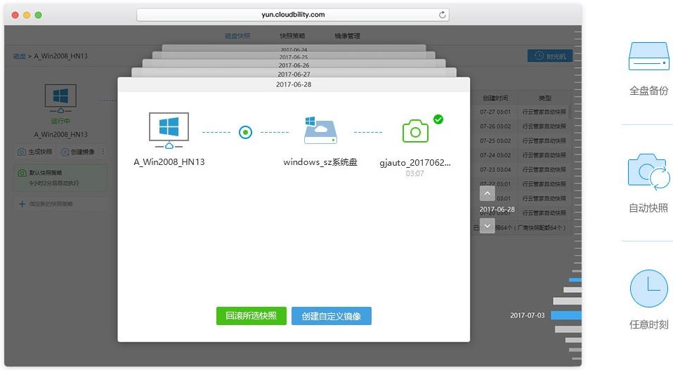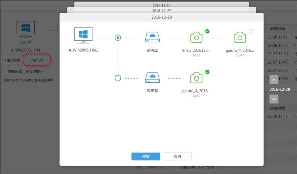点击主机的“时光机”按钮,主机下的磁盘快照将以时光机的形式展现,用户可以选择需要回滚的快照和时间点执行回滚操作(同时只能回滚同一天的快照)。
