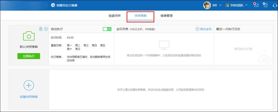 1、查看自动快照策略在“基础运维”的“磁盘快照”页面下点击“快照策略”,打开自动快照策略,系统默认为每个用户创建了一个快照策略。