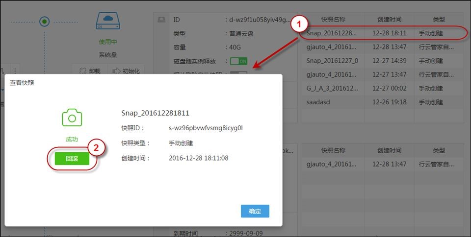 回滚前,请确保主机已停机。双击一个状态为“已完成”的快照,打开该快照的详情,点击“回滚”按钮,确认后即开始回滚。