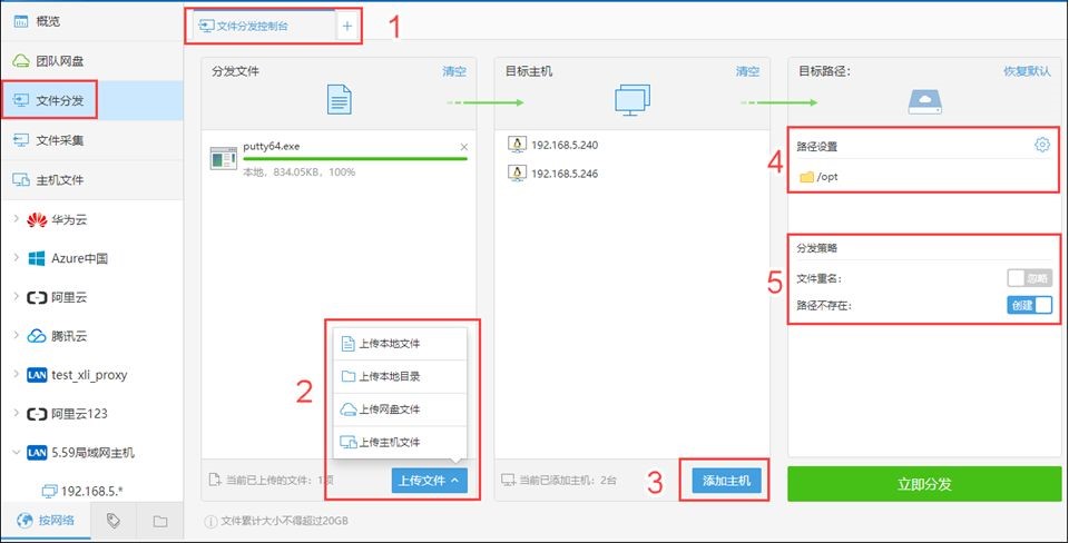 (2)将需要分发的文件传输到控制台中,目前支持上传“本地文件”、“本地目录”、“网盘文件”、“主机文件”;