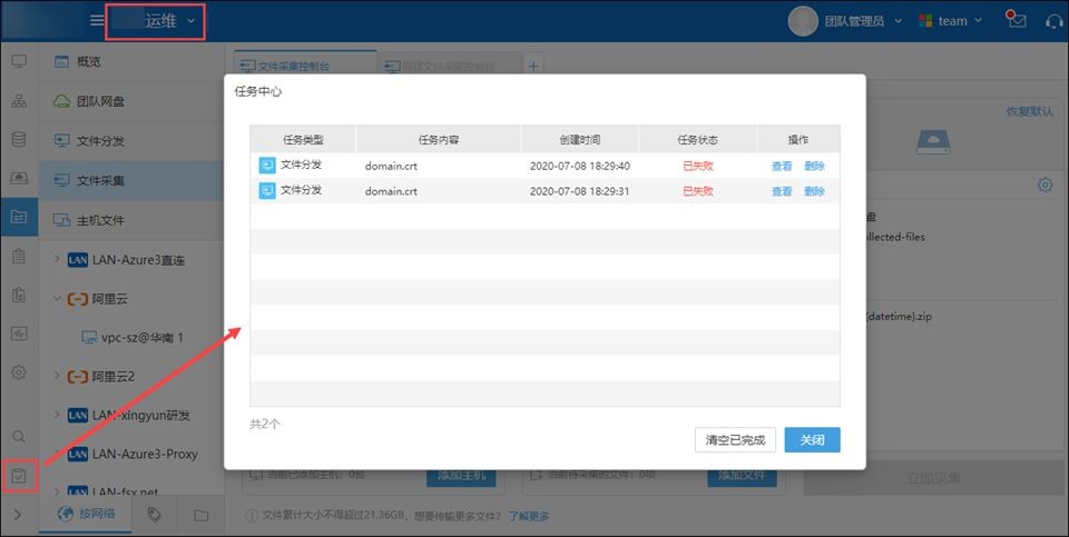 分发采集后,在“基础运维”左下角“任务中心”中可以查看可以查看文件采集情况。