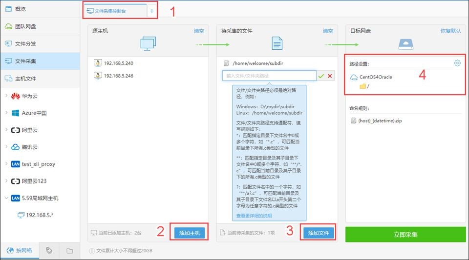 2、文件采集在文件批量操作场景中,除文件分发外,还存在从多台主机中批量采集某些共同特征文件的情况,如:定期收集多台主机上的日志文件。在行云管家中,我们可以通过文件采集控制台来实现这个需求。