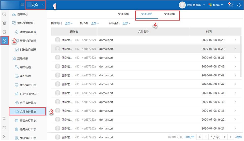 点击“安全中心”菜单下的“ 堡垒机”,点击“文件审计日志”即可查看文件分发及文件采集审计日志。