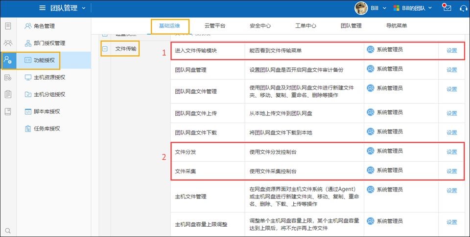依次点击“团队管理”、“权限管理”、“功能授权”、“基础运维”、“文件传输”。