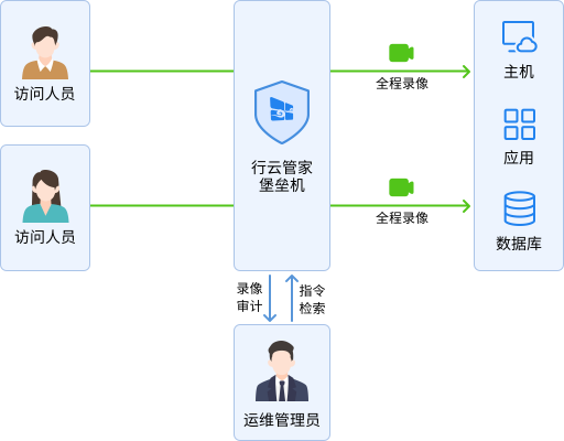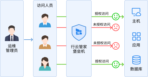 行云管家堡垒机支持对多种类型的设备和应用进行集中统一管理,不论是公有云、私有云、局域网/IDC托管设备、网络设备、存储设备或数据库、业务应用,都能够让您在一个主控台中完成对IT异构资源、数据库与应用的统一运维。