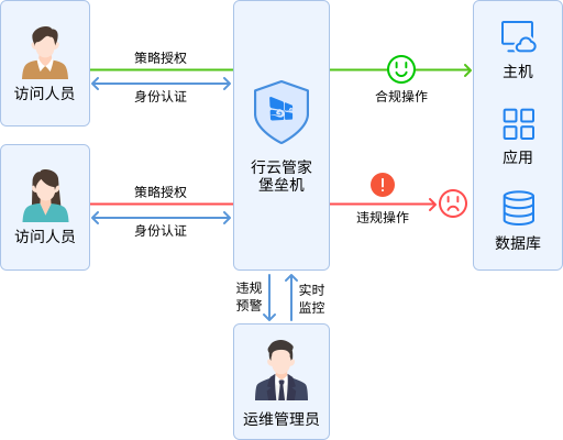 行云管家堡垒机也是企业IT资产进行运维的统一入口,承担对用户进行统一的身份认证、资源授权的职责。支持企业组织架构树的权限分配,提供精细化的策略授权,可实时监控运维行为,及时发现违规操作并预警,拦截恶意指令,规避误操作、违规操作的发生。
