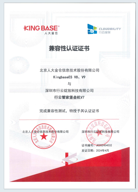 继 行云绽放 与瀚高完成兼容性认证后,再添一喜, 行云管家堡垒机 与人大金仓完成兼容性认证。测试结果表明,行云管家堡垒机V7与金仓数据库管理系统KingbaseES V8、V9完全兼容,其功能、性能和兼容性等方面表现良好,运行稳定、安全。