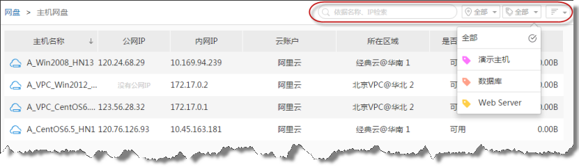在磁盘快照、主机网盘等需要罗列主机的相关页面中,一旦出现大量主机时,用户将难以定位到准确的主机,本版本提供了主机关键字检索及按照云账户、标签过滤的方式来定位主机。