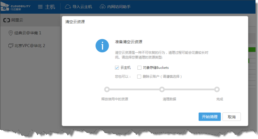 在本版本新增了对象存储资源的管理,因此对“删除云账户”进行调整,改为“清空云资源”,允许用户仅清空云账户下的云资源而保留云账户,同时也支持云主机和对象存储资源的清理。