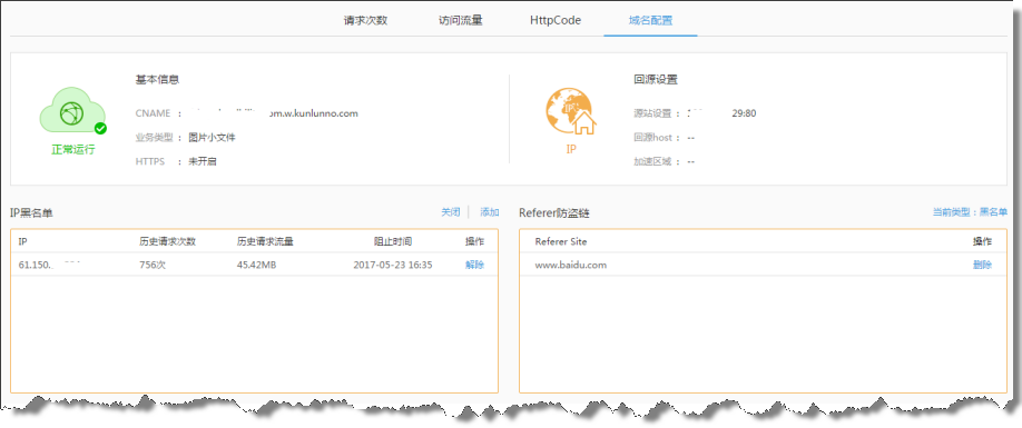 增加CDN加速域名的配置,用户可对IP黑名单、Referer防盗链等进行直接的配置,加强CDN的安全防护措施;