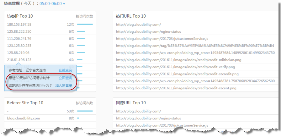 在监控热点数据中,可直接查看某IP/Referer Site近30天的请求数据,用户根据这些请求数据,如果认为存在非法请求的嫌疑,可直接将IP/Referer Site加入到黑名单中;