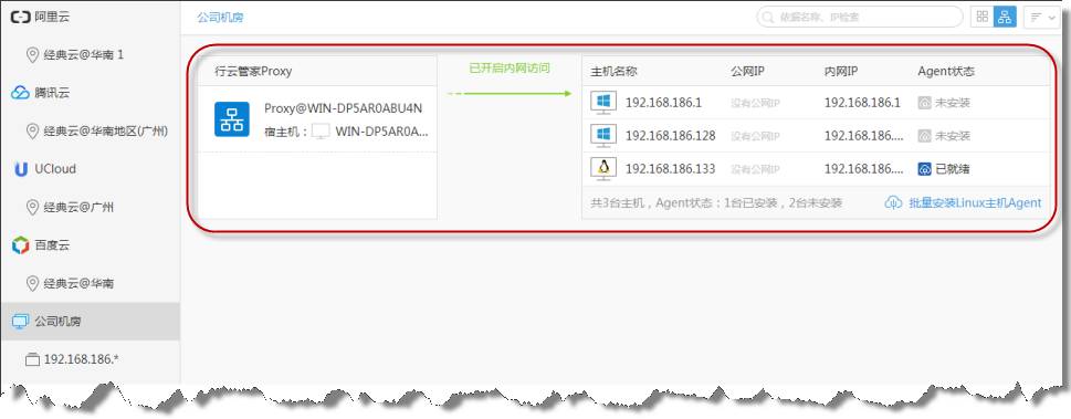 主机已具备列表和图标两种视图,能够满足大多数情况下的需求,但产品中存在的一些概念,如内网访问助手和行云管家Proxy,涉及到网络代理层面的一些关系,为了更好的展示这些关系,我们增加了网络拓扑视图,方便用户一目了然的理解云账户的区域/专有网络/局域网中的主机拓扑关系,更好的使用内网访问助手和行云管家Proxy。