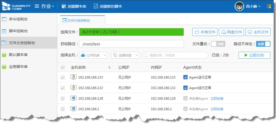 文件分发也是自动化运维不可或缺的功能,行云管家文件分发控制台支持从本地、网盘、主机中将文件批量分发至目标主机,解决用户打补丁、版本升级等自动化运维场景。