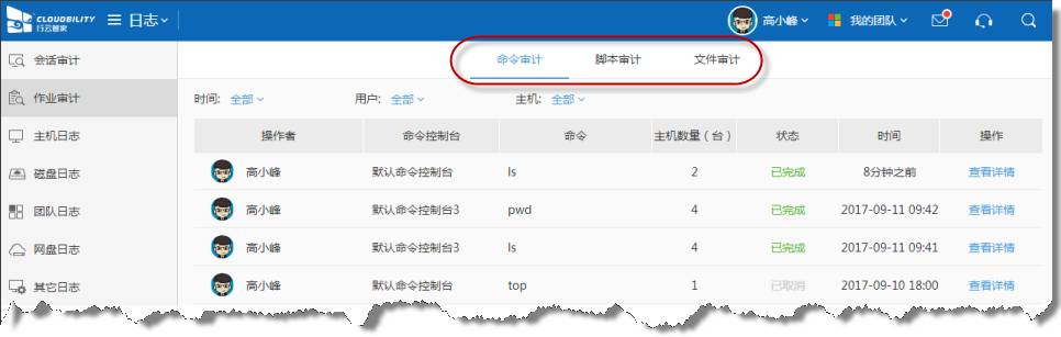 在作业中心的命令控制台、脚本控制台、文件分发控制台中所执行的操作,均已提供了相关的审计。