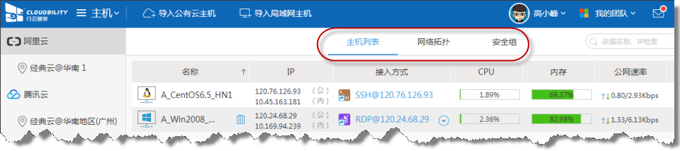 优化主机展示方式,将原有的视图模式改为Tab模式,提供:主机列表、网络拓扑、安全组(仅针对云主机)三个Tab,使得主机UI结构清晰,尤其是云主机安全组,入口更加明显。