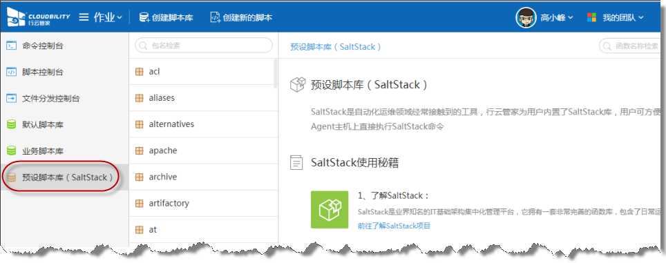 丰富了脚本库的内容,为用户在作业中心预设了业界知名的SaltStack脚本库,这些脚本库足以满足日常运维的需求,用户可以直接在主机上执行预设好的SaltStack脚本库。