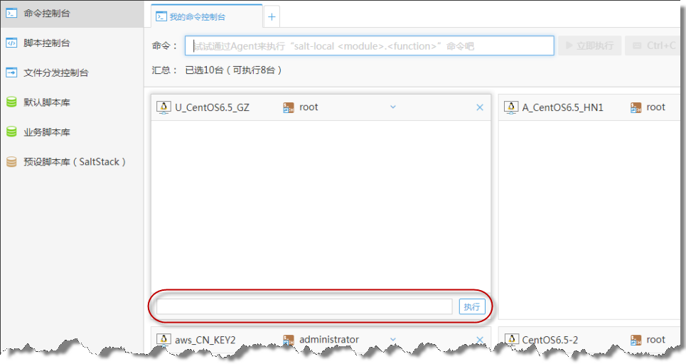 当命令控制台中主机数量众多,而用户临时只想对某台主机执行命令时,可选中该台主机,在下方直接对该台主机执行命令。