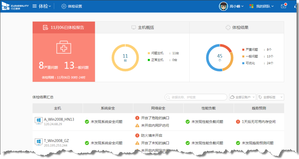 主机体检主要检查的是主机在某个时刻的各种状态,包括安全设置、性能负载等指标,这些指标并不具备长期的参考意义。因此我们对体检中心进行了大幅优化,每台主机仅会针对当前各种指标进行体检并形成体检结果,不再保留主机以往的体检报告。