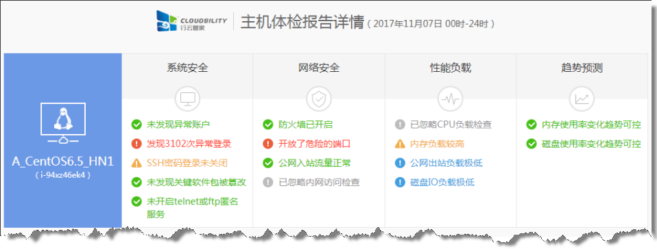 大幅优化了主机体检项,取消了主机可用性体检,将主机体检范围重新调整为:系统安全、网络安全、性能负载、趋势预测四个维度。其中系统安全是新增体检范围,包含了:异常账户检查、异常登录检查、SSH密码登录检查、关键软件包检查、匿名访问服务检查五个体检项,后期我们还将陆续新增多个系统安全体检内容。