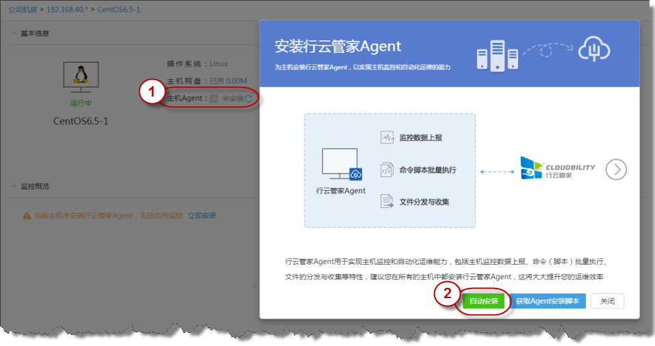 在为主机安装行云管家Agent时,除了批量和手动安装外,也支持单台主机的自动安装,用户只需在主机详情页中点击安装Agent,一键即可完成Agent的自动安装。
