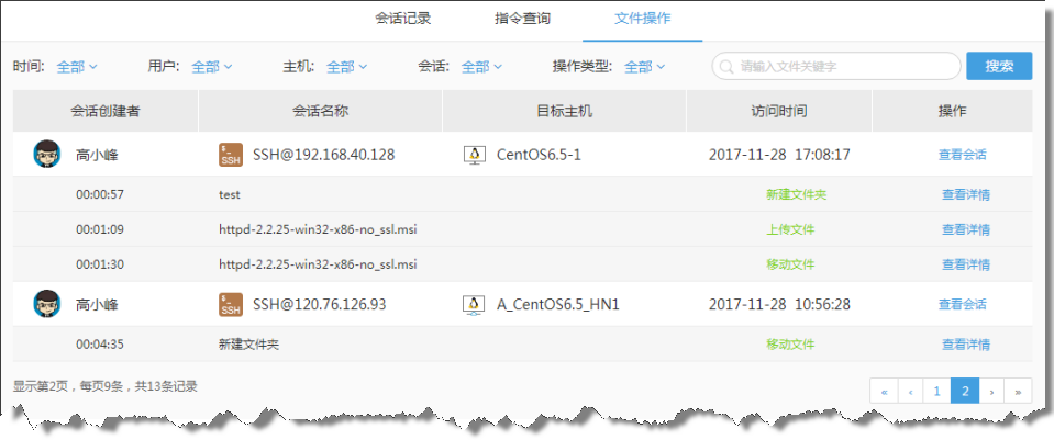 在会话传输面板中执行的文件操作行为,也被纳入到会话审计中,并支持文件关键字全局检索,全方位的堵住运维安全漏洞。