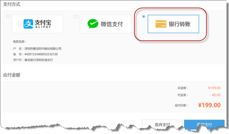 用户在行云管家订单支付环节,新增银行转账的支付方式,方便用户通过线下银行转账的方式来购买行云管家服务。