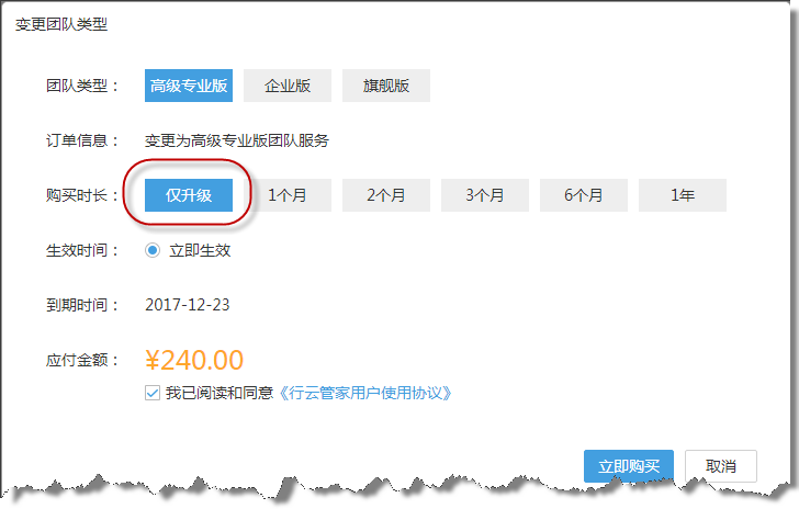 在以往的版本中,用户想要变更团队类型必须和续费同时进行。部分已经购买了较长时间服务的行云管家用户,由于配额已经不满足实际情况,希望能在服务期限内进行版本升级。本版本允许团队在不续费的前提下,仅在当前服务期限内进行升级,不必再通过续费的方式变更团队类型。