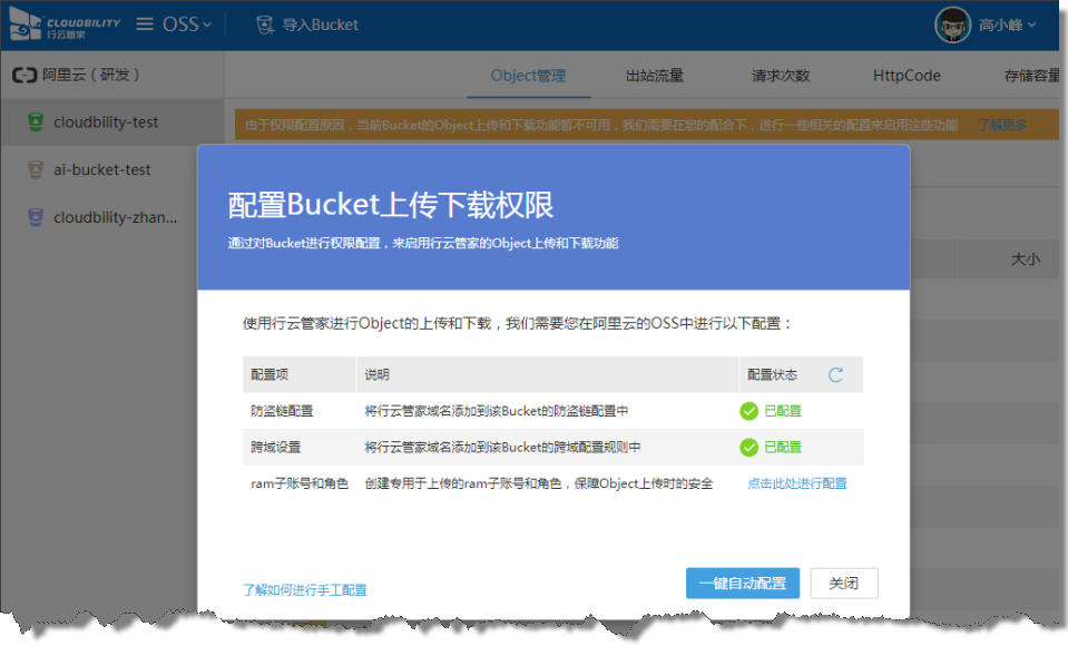 行云管家提供了基于B/S架构实现的Object上传、下载、复制、移动等功能,而云厂商为了保护对象存储服务的安全性,提供了一系列的安全设置,例如:防盗链、跨域设置、访问签名,这些安全设置对于浏览器客户端会有很大影响,在以往版本中,这些设置由行云管家自动完成,但由于涉及到用户的业务系统,因此在本版本中,允许用户自行前往厂商控制台配置或授权行云管家一键自动配置,确保用户的知情权。