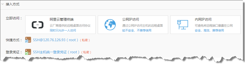 优化行云管家主机访问方式的体系,将接入方式由控制台管理终端、公网IP访问、内网IP访问三个维度,改为立即访问、快捷方式访问、登录凭证访问三个维度。快捷方式适用于保存单台主机的登录信息,并可以分享给指定的成员使用,无需向其透露主机用户名密码。登录凭证可以批量指定主机的登录信息,且为团队全部成员可见。