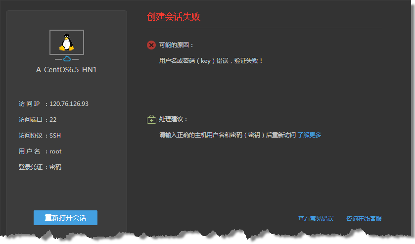 会话创建失败是使用行云管家时常遇到的“小挫折”,产生的原因可能是输错用户名密码这种小错误,也可能是服务器安全设置等比较复杂的问题,本版本优化了会话创建失败的错误提示展现形式,能够深度捕捉50余种错误产生原因,行云管家希望能够尽可能更详细的将错误原因告知用户,让用户能够通过错误信息、处理建议、帮助文档等参考信息自行排除问题,及时解决问题。