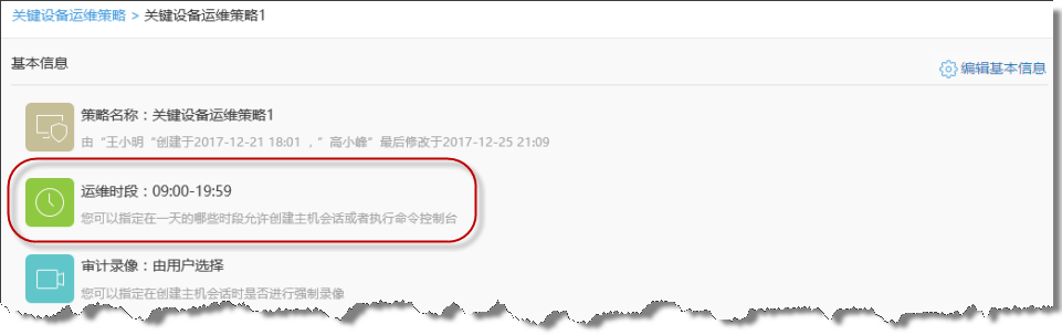 针对部分用户对于主机访问时段的限制需求,我们在运维策略中增加了运维时段的设置,用户可根据实际情况设置允许访问的时段,默认情况下为全天均可访问。