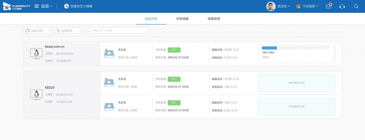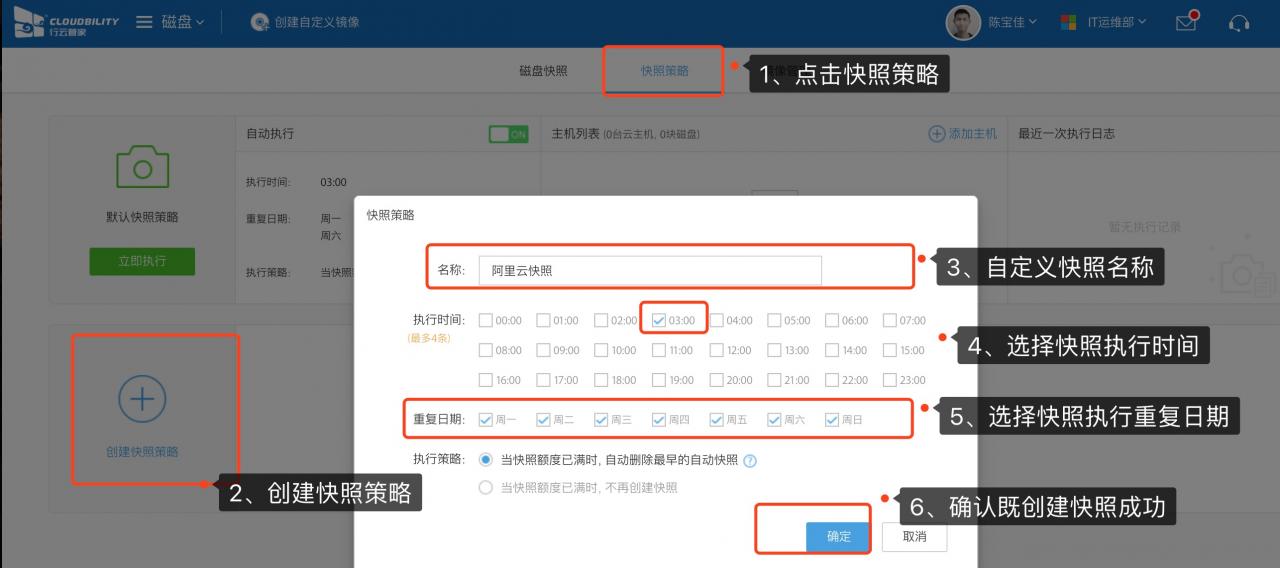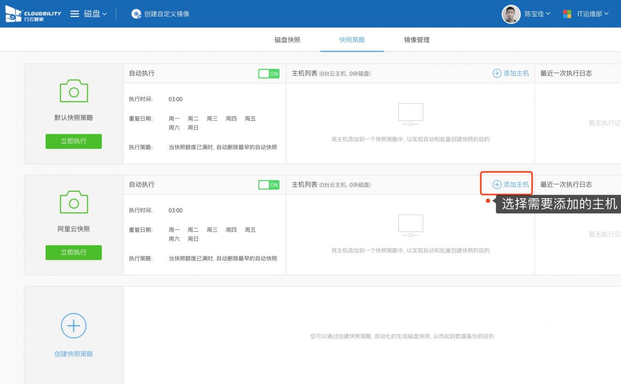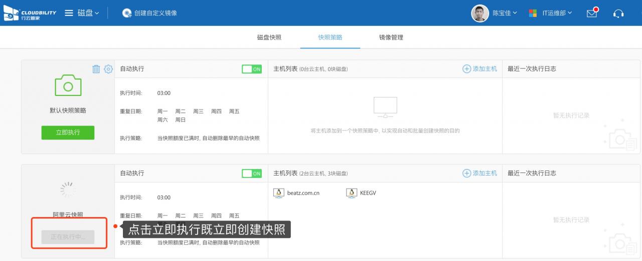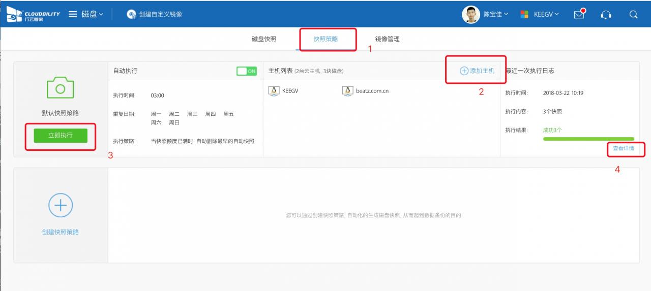 可以看到行云管家对快照功能做的优化,我们能够非常清楚的看到当前快照的数量和快照详细信息,可以手动执行快照和通过创建快照策略来自动触发操作。备份的时间建议大家选择在业务低谷的时候,每个公司的业务场景不同,可以根据自身业务场景来选择备份时间,一般可选择凌晨3点-4点。
